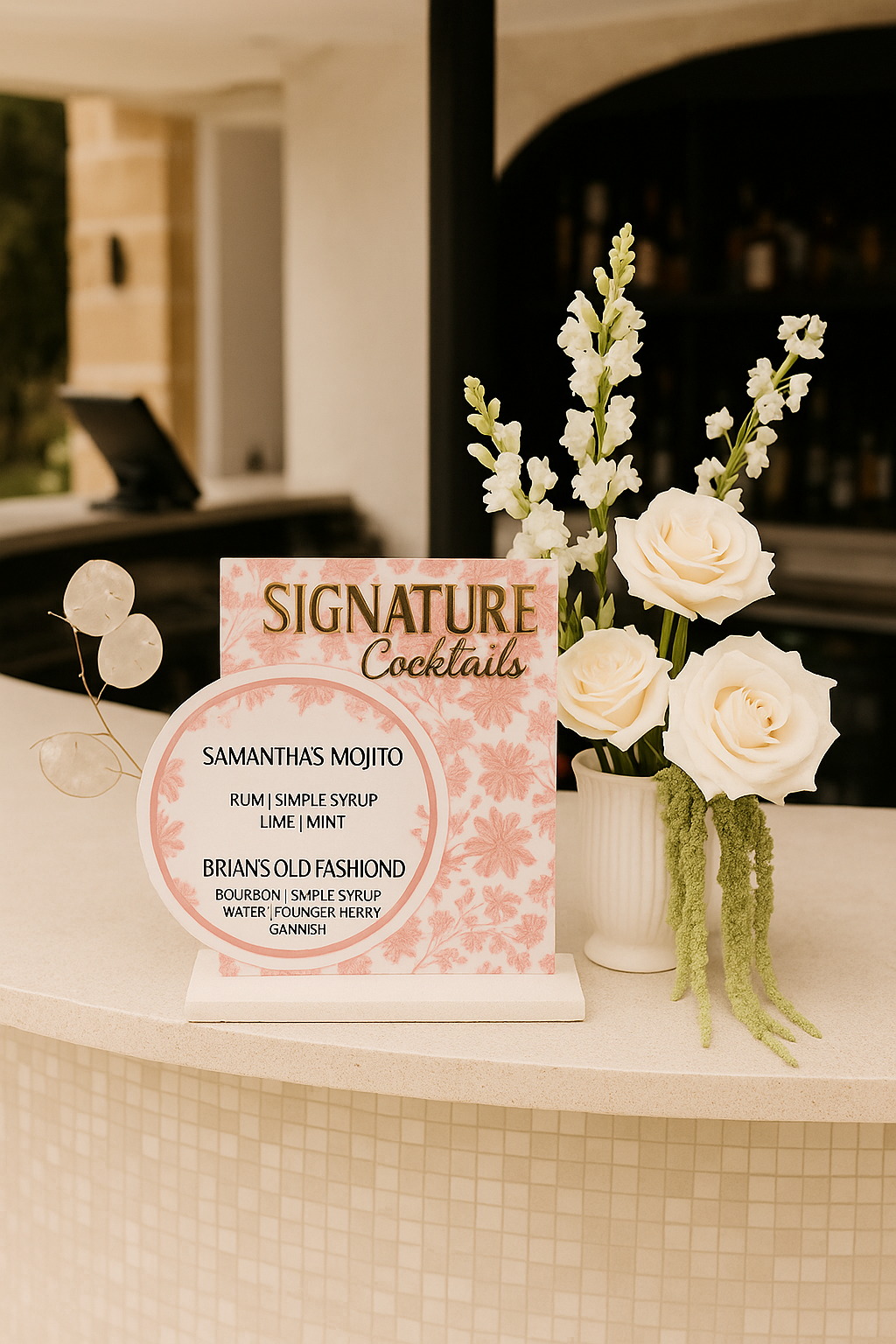 Create a lasting impression with a personalized acrylic bar menu—designed to charm your guests and elevate your celebration, sip by sip.